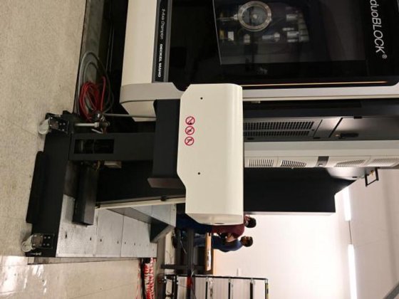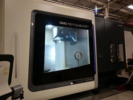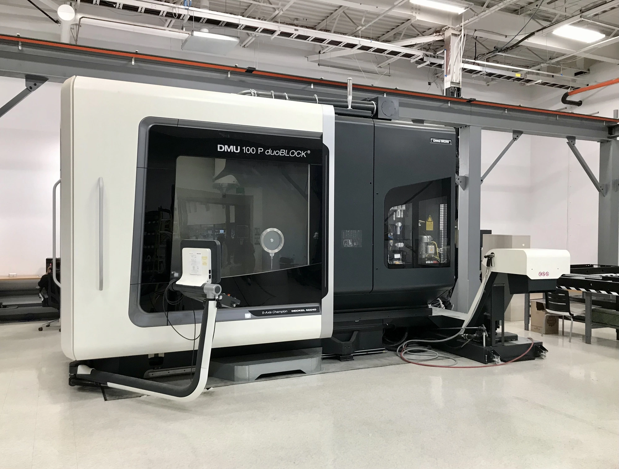 DMG Mori DMU 100P DUOBLOCK 5-Axis CNC Machining Center, 2018 MANUFACTURER: DMG MORI MODEL: DMU 100P DUOBLOCK YEAR: 2018 SPECIFICATIONS: X-Axis Travel 39.4" Y-Axis Travel 49.2" Z-Axis Travel 39.4" Table Size 43.3" x 35.4" Table Indexing 0.001 Degree Table Speeds 35 RPM Table Load Capacity 4,900 lbs Spindle Head Swivel Range -30/+180 Degrees Spindle Speed Range 0-12,000 RPM Spindle Taper HSK-A 100 Spindle Motor 69 HP Automatic Tool Changer 63 ATC Floor Space Requirement 258.3 Square Feet Approximate Machine Height 142 Inches Approximate Machine Weight 54,100 Pounds Equipped With: Heidenhain TNC-640 3D CNC Control Universal B-Axis Swiveling Spindle 43.3" x 35.4" Contouring Table 63-Position Automatic Tool Changer Probing Tool Measurement 3D Quickset Coolant Thru-Spindle (80 Bar) Chip Conveyor HOURS: POWER ON: 652 CUTTING TIME: 146 *** MACHINE IS LIKE BRAND NEW CONDITION ***