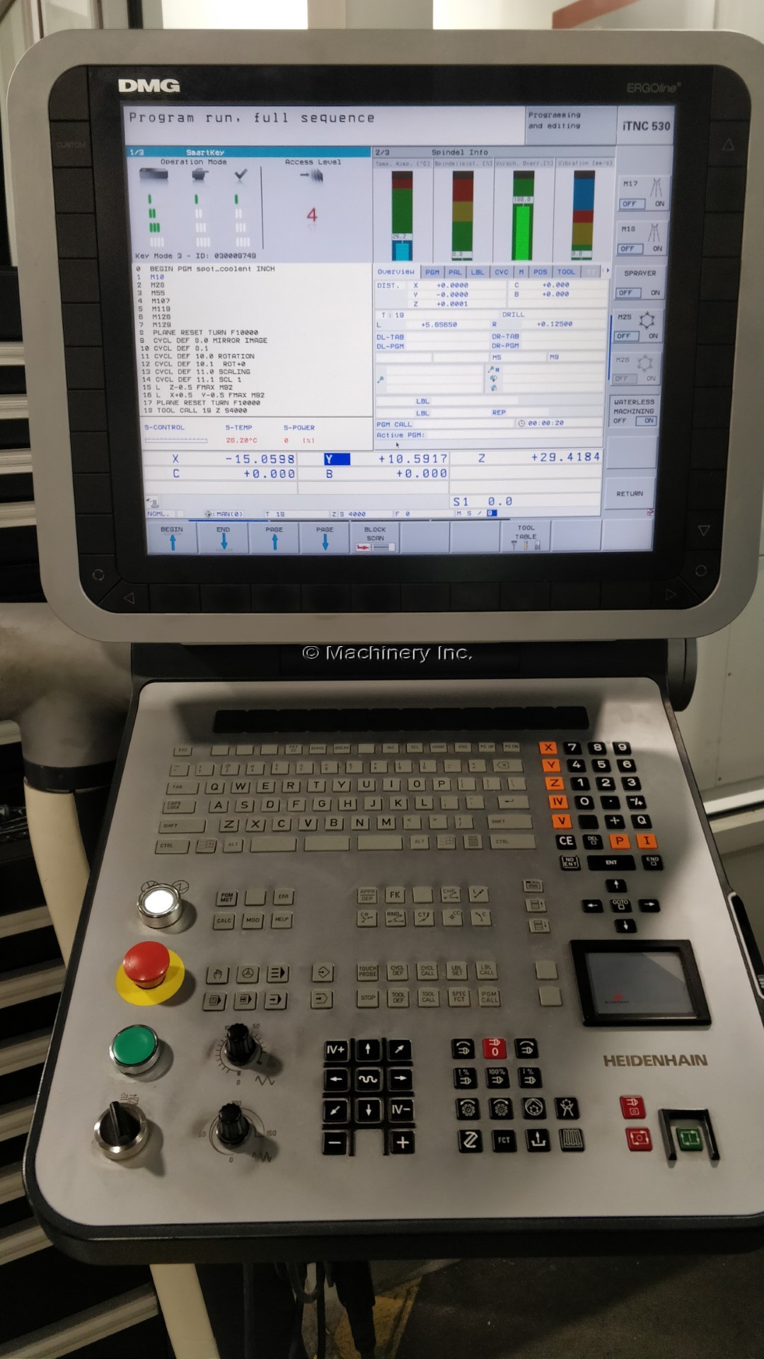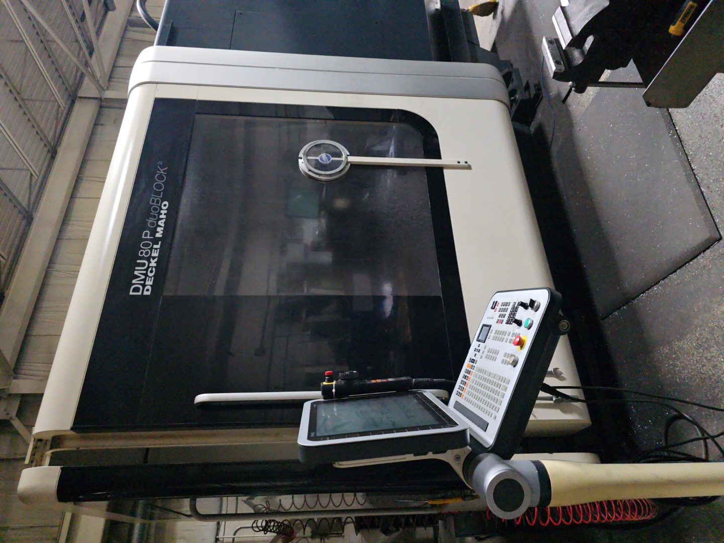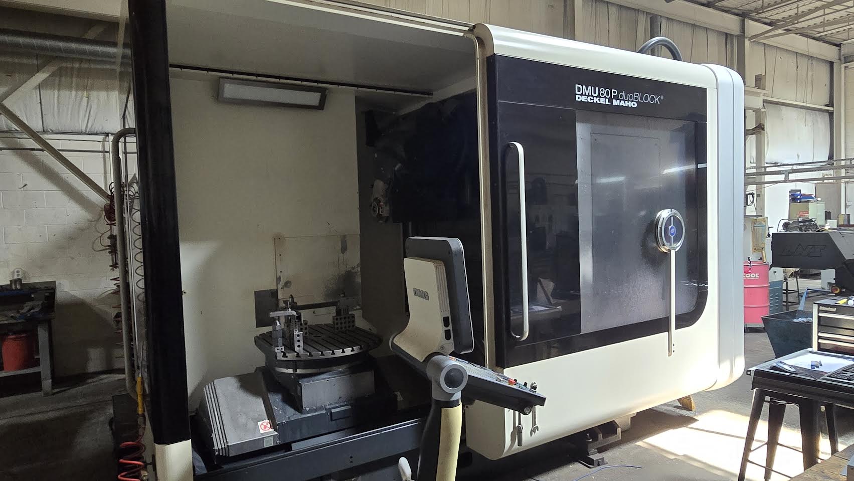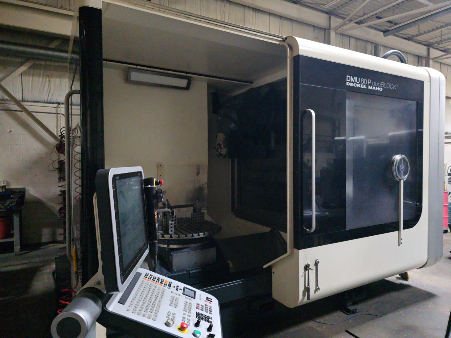 DMG DMU 80P DUOBLOCK 5 AXIS UNIVERSAL MACHINING CENTER, 2009 MANUFACTURER: DECKEL MAHO MODEL: DMU 80P DUOBLOCK YEAR: 2009 TRAVELS: X-AXIS: 31.5" Y-AXIS: 31.5" Z-AXIS: 31.5" C-AXIS: 360° A-AXIS: 180° SPINDLE SPEED: 18,000 RPM SPINDLE TAPER: CAT40 40 AUTOMATIC TOOL CHANGER COOLANT THROUGHT SPINDLE (600 PSI) HEIDENHAIN ITNC530 CNC CONTROL