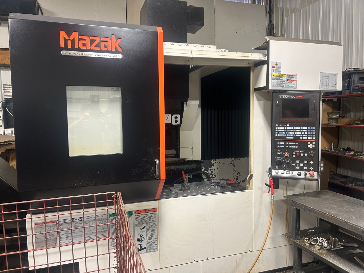 MAZAK VCU 500C CNC VERTICAL MACHINING CENTER, 2016 YEAR: 2016-08 ONLY 781 CUTTING HOURS!!! CUT ALUMINIUM ONLY! STANDARD SPECIFICATIONS: Table Size 19.69 x 41.34 Maximum Workpiece Size .. 19.69 x 39.37 Maximum Workpiece Height 20.07 X-Axis Travel . 39.37 Y-Axis Travel . 19.88 Z-Axis Travel . 20.08 Table Surface Height . ... 26.97 Maximum Table Weight Capacity .. 1300 LBS Spindle Face to Table Surface (Min/Max) ... 4.53 / 21.65 Optional Spindle Speed / Motor (5-min). ..... 12,000 RPM / 25 HP Spindle Taper Taper #40 Rapid Traverse (X,Y,Z) 1181IPM Number of Tools 20 Maximum Tool Diameter (adjacent tools) . 3.15 Maximum Tool Diameter ( no adjacent tools) . 4.92 Maximum Tool Length . 10.23 Tool Shank Type CAT #40 Machine Height .. 131.81 Floor Space (w x l) . 108.27 x 125 Machine Weight.. .. 18000 Lbs EQUIPPED WITH: SMART CNC CONTROL 4 AXIS KITAGAWA MR160 NC ROTARY TABLE CTS (COOLANT THROUGH SPINDLE) 71 PSI JORGENSON HINGE CHIP CONVEYOR LEFT SIDE DISP. (48" DISCHARGE) - E-STOP FOR CHIP CONVEYOR AUTO TOOL LENGTH MEASUR. & BREAK. DETECT. (PLUNGER TYPE) LAN PORT B GOO SLOPE CONSTANT B SYNCHRONIZED TAPPING (G84.2 / G84.3) POLAR COORDINATES INPUT (G122) ABSOLUTE ENCODER SYSTEM