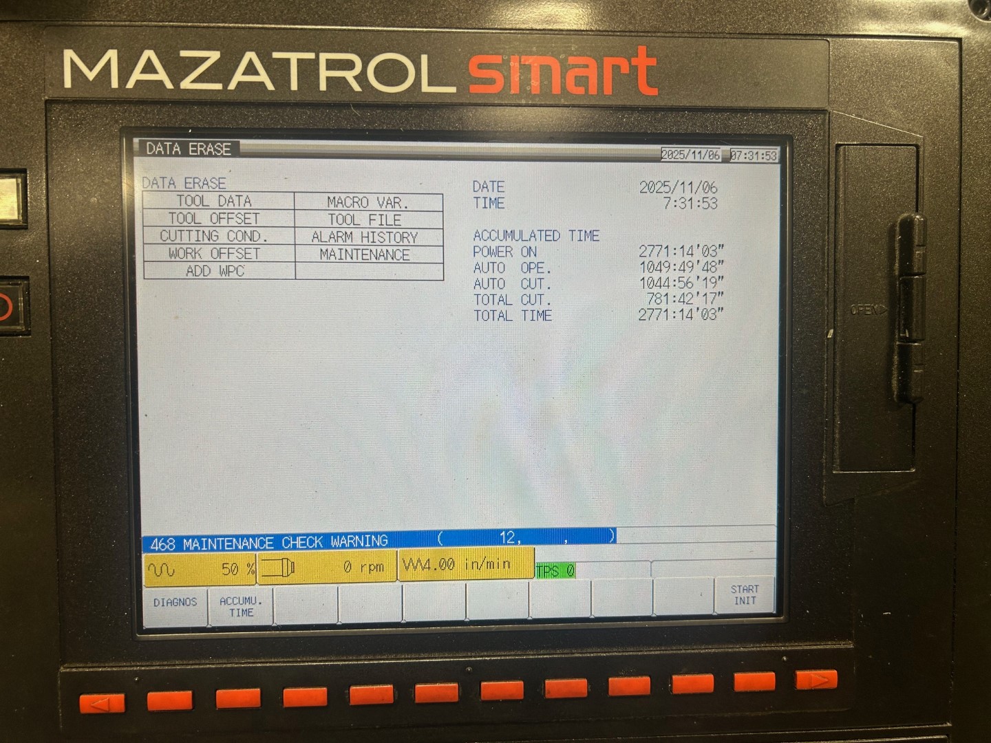 MAZAK VCU 500C CNC VERTICAL MACHINING CENTER, 2016 YEAR: 2016-08 ONLY 781 CUTTING HOURS!!! CUT ALUMINIUM ONLY! STANDARD SPECIFICATIONS: Table Size 19.69 x 41.34 Maximum Workpiece Size .. 19.69 x 39.37 Maximum Workpiece Height 20.07 X-Axis Travel . 39.37 Y-Axis Travel . 19.88 Z-Axis Travel . 20.08 Table Surface Height . ... 26.97 Maximum Table Weight Capacity .. 1300 LBS Spindle Face to Table Surface (Min/Max) ... 4.53 / 21.65 Optional Spindle Speed / Motor (5-min). ..... 12,000 RPM / 25 HP Spindle Taper Taper #40 Rapid Traverse (X,Y,Z) 1181IPM Number of Tools 20 Maximum Tool Diameter (adjacent tools) . 3.15 Maximum Tool Diameter ( no adjacent tools) . 4.92 Maximum Tool Length . 10.23 Tool Shank Type CAT #40 Machine Height .. 131.81 Floor Space (w x l) . 108.27 x 125 Machine Weight.. .. 18000 Lbs EQUIPPED WITH: SMART CNC CONTROL 4 AXIS KITAGAWA MR160 NC ROTARY TABLE CTS (COOLANT THROUGH SPINDLE) 71 PSI JORGENSON HINGE CHIP CONVEYOR LEFT SIDE DISP. (48" DISCHARGE) - E-STOP FOR CHIP CONVEYOR AUTO TOOL LENGTH MEASUR. & BREAK. DETECT. (PLUNGER TYPE) LAN PORT B GOO SLOPE CONSTANT B SYNCHRONIZED TAPPING (G84.2 / G84.3) POLAR COORDINATES INPUT (G122) ABSOLUTE ENCODER SYSTEM