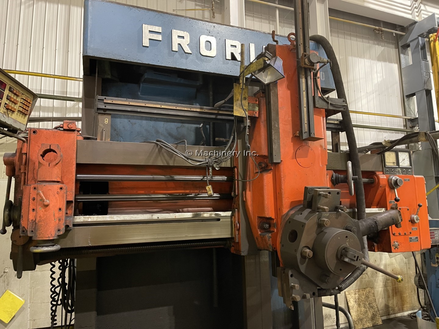 63" Froriep Model KE-Super KE16 Vertical Boring Mill Diameter of 4 Jaw Chuck: 63" (1,600.2 mm) Max Swing: 71" (1,803.4 mm) Height Under Rail: 47" (1393.8 mm) Table Speed: 2.5 - 125 RPM Feed Rates: .003 - - .20 (12) Main Motor Drive: 50HP Equipped With: Turret Head Side Head 63" 4 Jaw Table with Top Jaws OVERALL DIMENSIONS: FRONT TO BACK: 11 FEET HEIGHT: ALMOST 12'