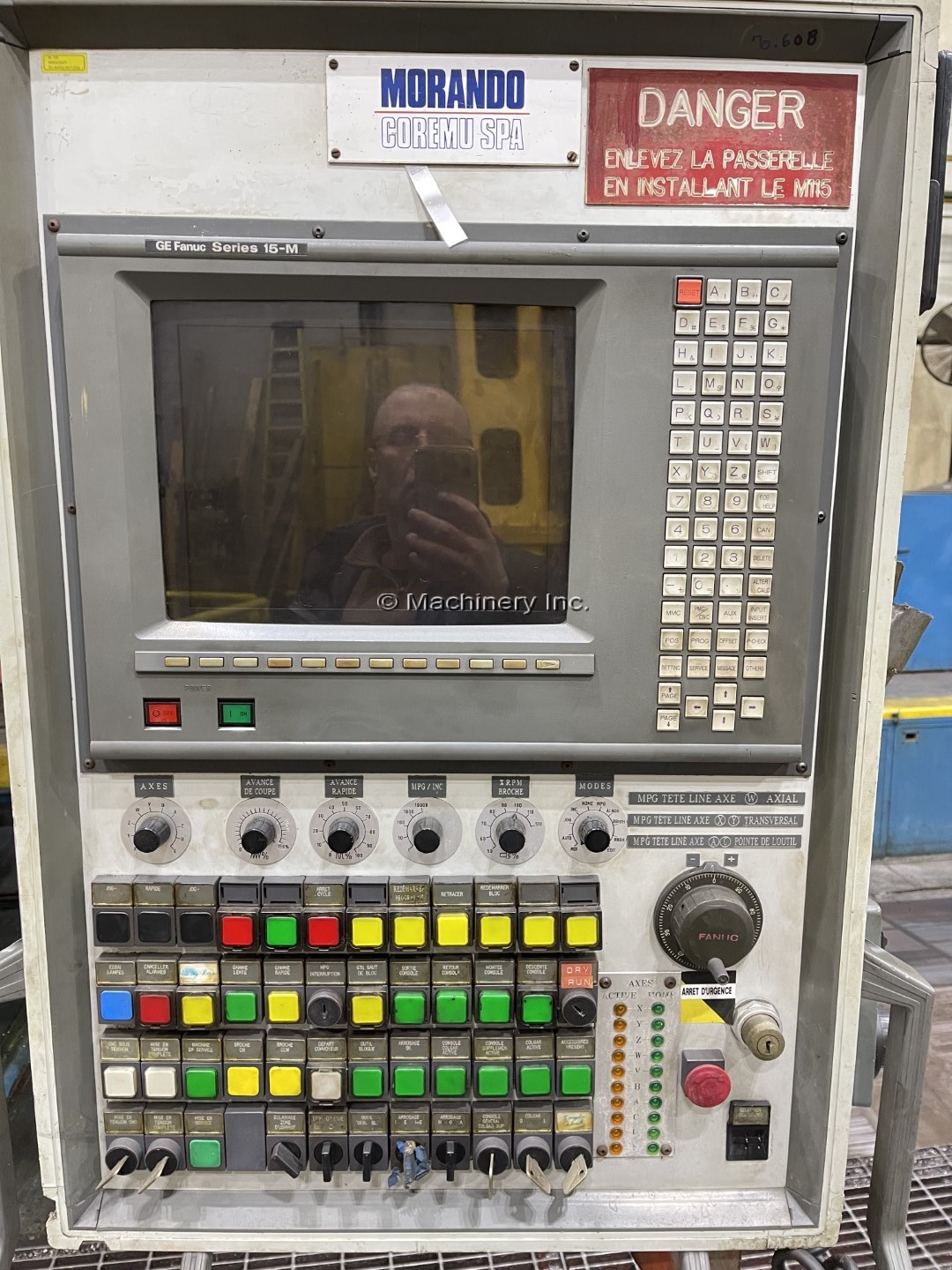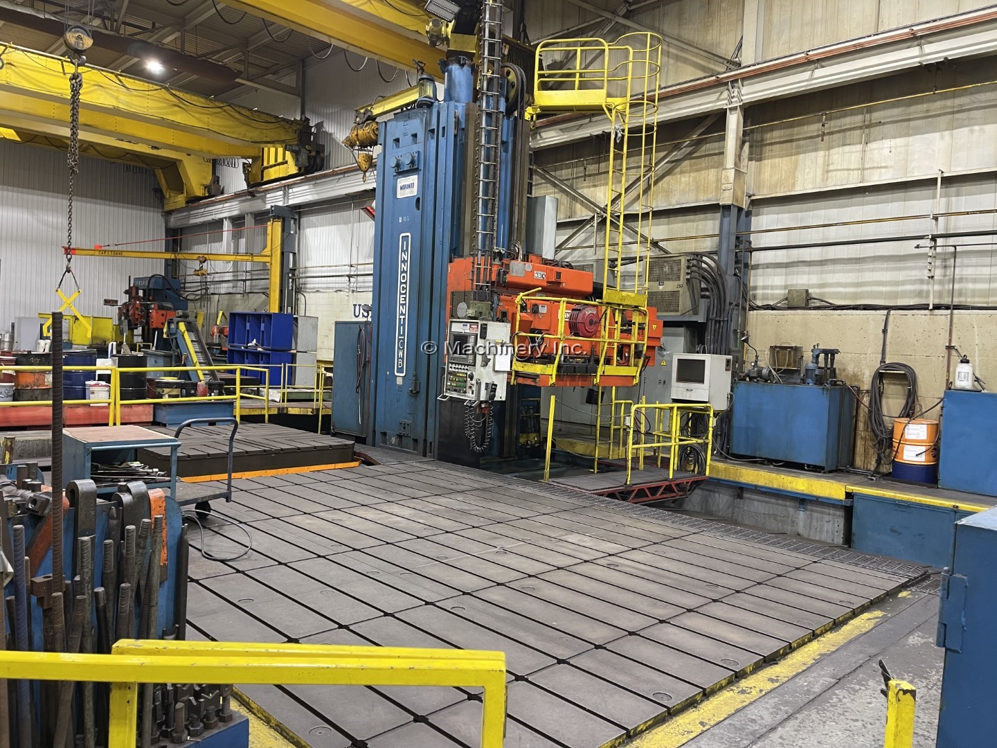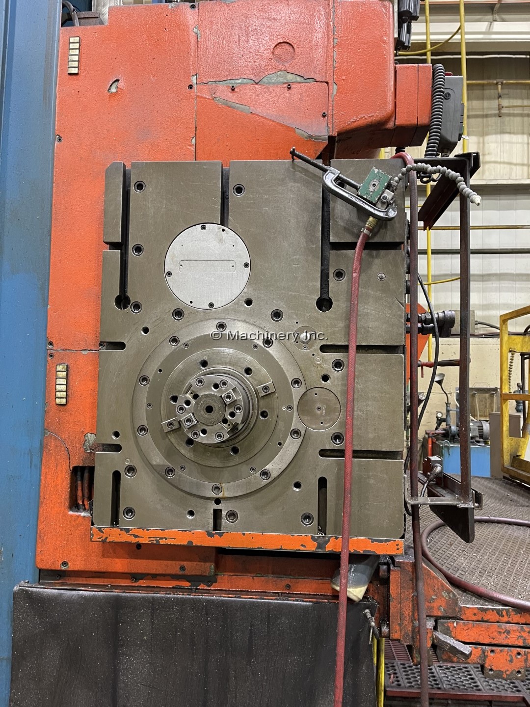 6" Innocenti 10-Axis CNC Ram Type Floor Horizontal Boring Mill Manufacturer: Innocenti Model: FAF 147.5 Year: Overhauled/Retrofitted completely in 1995 by MORANDO in Italy. Main Motor: 85 HP X Travel Column Horizontal 433" (36') (11000 MM) Y Travel Headstock Vertical 138" (11-1/2') (3500 MM) Z Travel Headstock, Ram Axial 29.5" (749.3 MM) W Spindle Axial 59" (1498.6 MM) Spindle Speeds: 5-1540 RPM Equipped With: FANUC 15M - 10 AXIS - CNC CONTROL 108" X 108" Colgar TRT 2000 2-Axis CNC Contouring & Infeeding Rotary Table W/ 105" Infeed Travel & 60 Ton Weight Capacity. Chip Conveyor OPTIONNAL(EXTRA COST): HENRI-LINE 2-AXIS HEAD FOR 5 AXIS SIMULTANEOUS MACHINING APPROX WEIGHT WITHOUT COLGAR ROTARY TABLE: 150,000 LBS