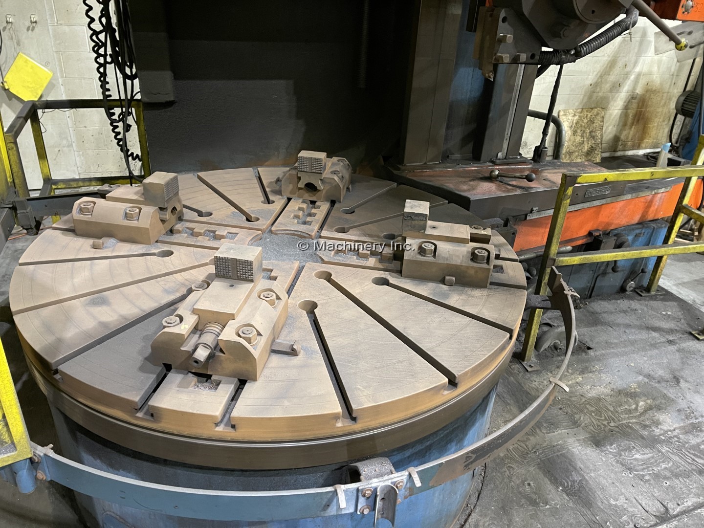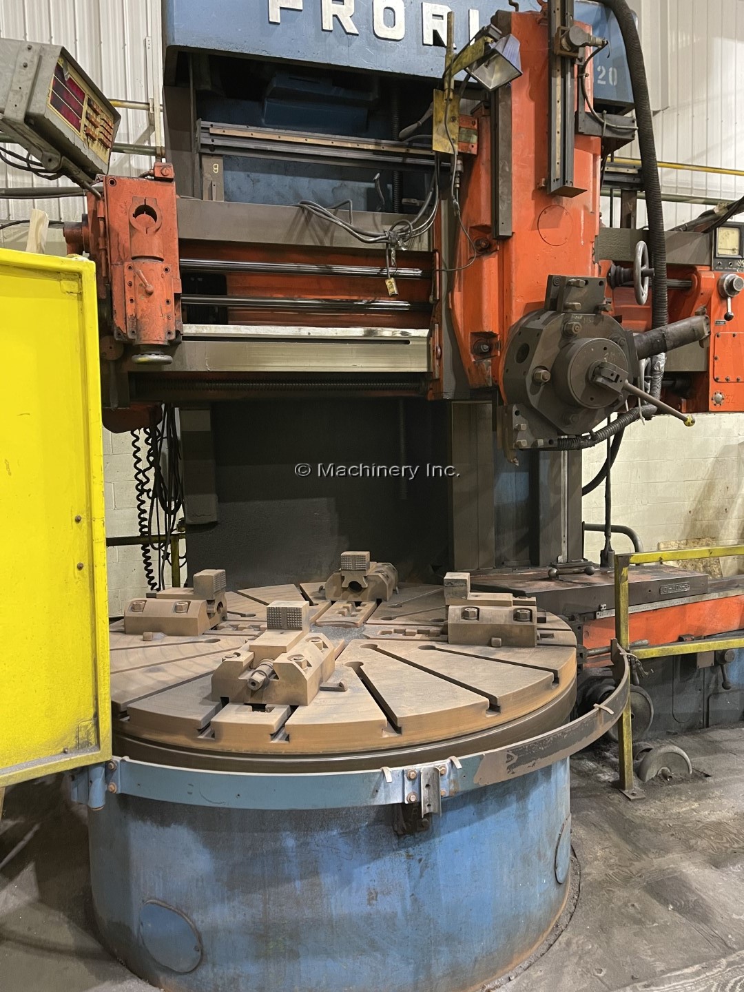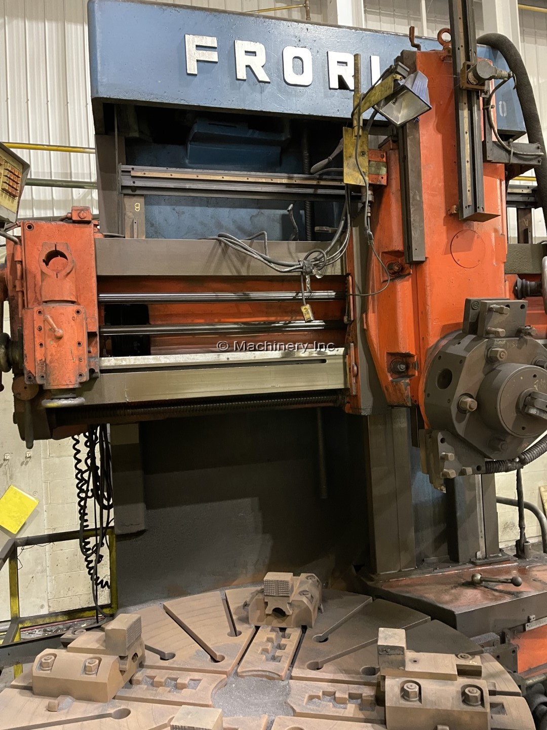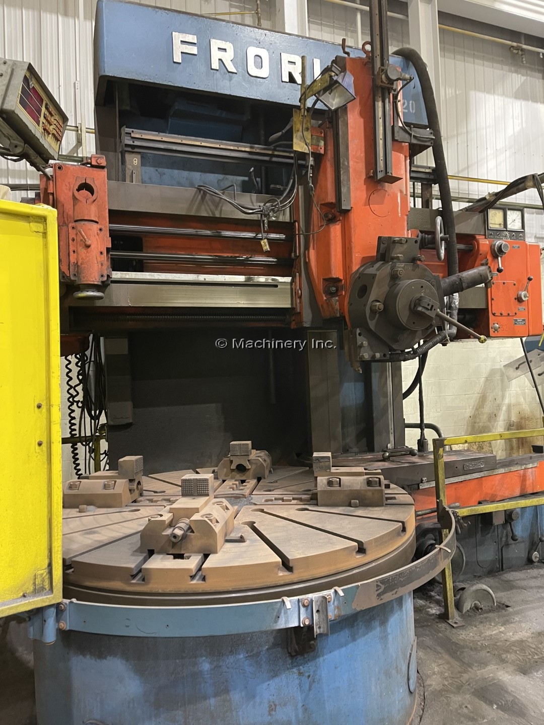 63" Froriep Model KE-Super KE16 Vertical Boring Mill Diameter of 4 Jaw Chuck: 63" (1,600.2 mm) Max Swing: 71" (1,803.4 mm) Height Under Rail: 47" (1393.8 mm) Table Speed: 2.5 - 125 RPM Feed Rates: .003 - - .20 (12) Main Motor Drive: 50HP Equipped With: Turret Head Side Head 63" 4 Jaw Table with Top Jaws OVERALL DIMENSIONS: FRONT TO BACK: 11 FEET HEIGHT: ALMOST 12'
